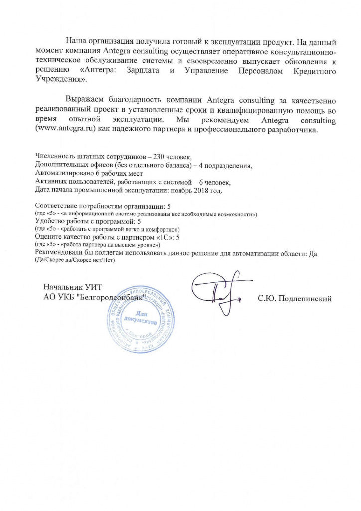 На данный момент компания Antegra consulting осуществляет оперативное консультационно-техническое обслуживание системы и своевременно выпускает обновления к решению «Антегра: Зарплата и Управление Персоналом Кредитного Учреждения».