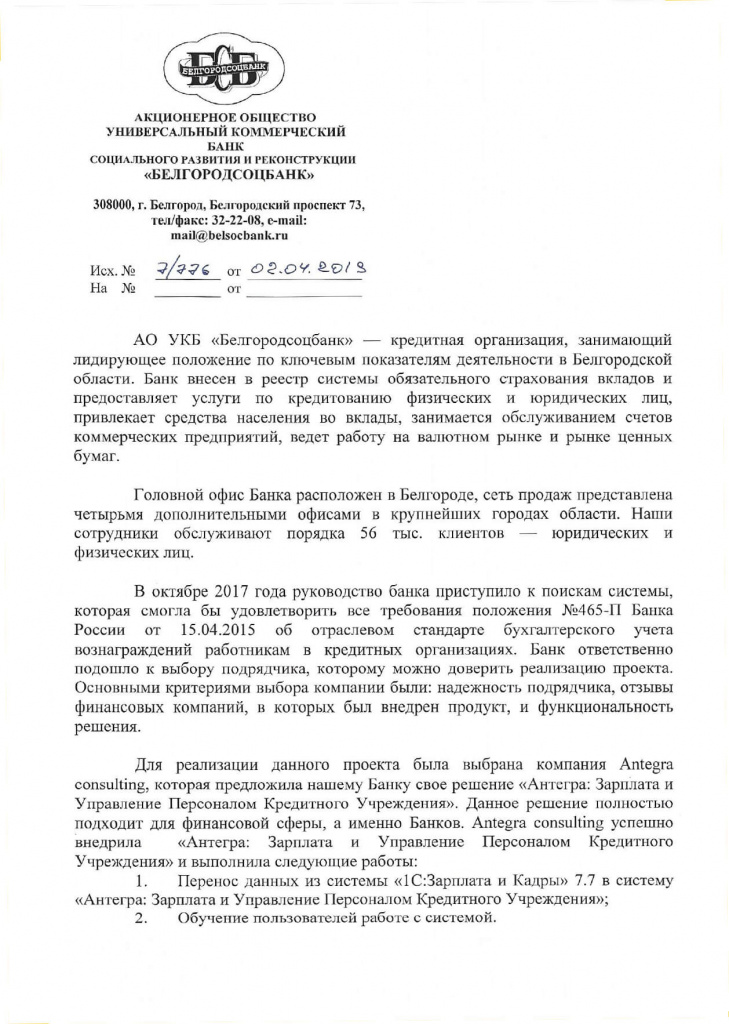 Руководство АО УКБ «Белгородсоцбанк» основательно подошло к выбору подрядчика, которому можно доверить реализацию проекта. Основными критериями выбора компании были: надежность подрядчика, отзывы финансовых компаний, в которых был внедрен продукт, и функциональность решения. Для реализации данного проекта была выбрана компания Antegra consulting, которая предложила нашему Банку свое решение «Антегра: Зарплата и Управление Персоналом Кредитного Учреждения». Данное решение полностью подходит для финансовой сферы, а именно Банков.
