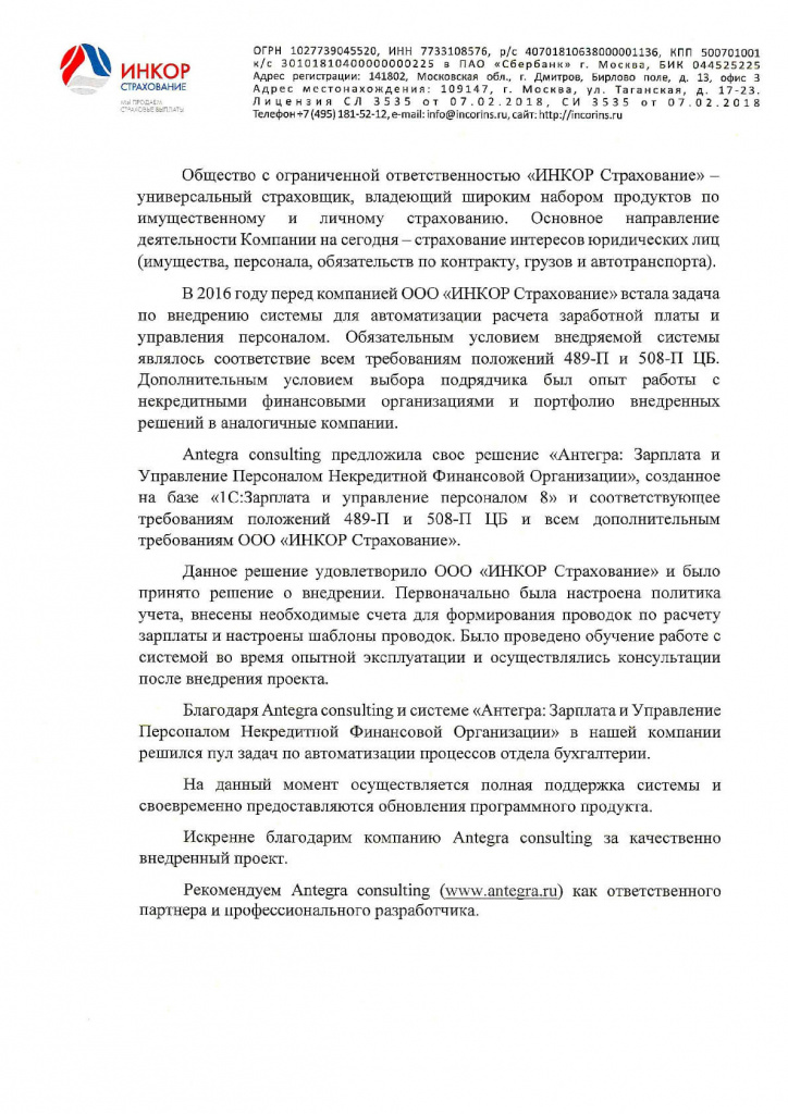 Antegra consulting предложила свое решение «Антегра: Зарплата и Управление Персоналом Некредитной Финансовой Организации», созданное на базе «1С:Зарплата и управление персоналом 8» и соответствующее требованиям положений 489-П и 508-П ЦБ и всем дополнительным требованиям ООО «ИНКОР Страхование».