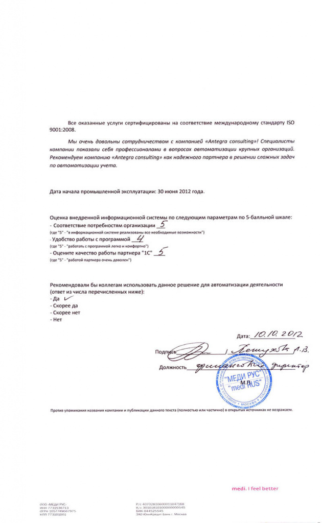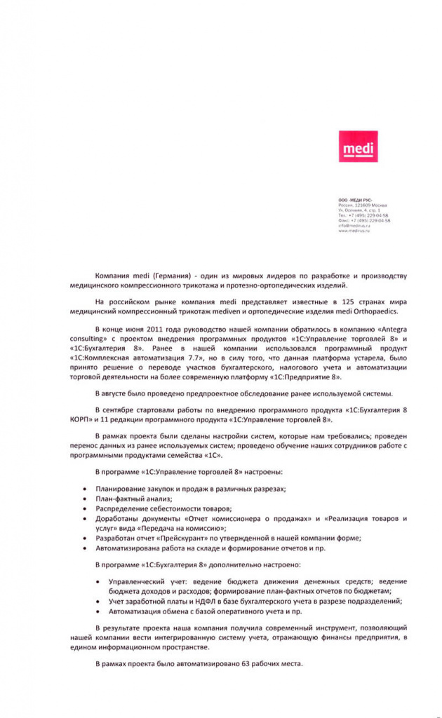 В конце июня 2011 года руководство компании «МЕДИ РУС» обратилось в компанию «Antegra consulting» с проектом внедрения программных продуктов «1С:Управление торговлей 8» и «1С:Бухгалтерия 8». Ранее в компании использовался программный продукт «1С:Комплексная автоматизация 7.7», но в силу того, что данная платформа устарела, было принято решение о переводе участков бухгалтерского, налогового учета и автоматизации торговой деятельности на более современную платформу «1С:Предприятие 8».