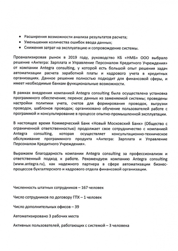 В настоящее время Коммерческий Банк «Новый Московский Банк» (Общество с ограниченной ответственностью) продолжает свое сотрудничество с компанией Antegra consulting, которая осуществляет консультационно-техническое обслуживание программного продукта «Антегра: Зарплата и Управление Персоналом Кредитного Учреждения».