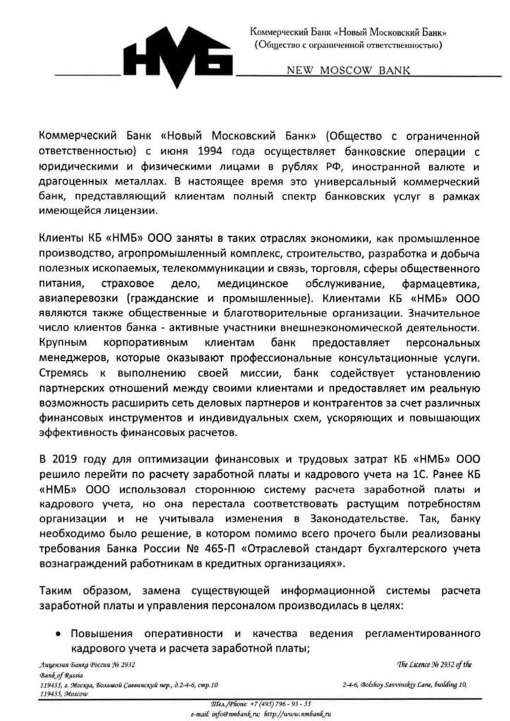 Проанализировав рынок в 2019 году, руководство КБ «НМБ» ООО выбрало решение «Антегра: Зарплата и Управление Персоналом Кредитного Учреждения» от компании Antegra consulting, у которой есть большой опыт решения задач автоматизации расчета заработной платы и кадрового учета в кредитных организациях. Данное решение полностью подходит для финансовой сферы, и имеет необходимые банкам функциональные возможности.
